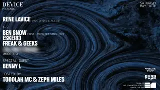 DeVice presents Benny L, Rene LaVice, Ben Snow, ESKEI83 & Freak & Geeks on May 16, 2026 at Onyx (E1), London features Rene LaVice, ESKEI83, Benny L and Zeph Miles performing drum & bass DJ sets.