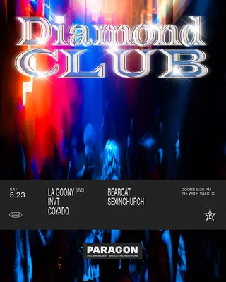 Diamond CLUB: La Goony (Live), INVT, Coyado + BEARCAT, SEXINCHURCH takes place at Paragon in New York City, United States on May 23, 2026. Featuring INVT, Coyado, BEARCAT, SEXINCHURCH. Techno and Neo Perreo sounds all night.