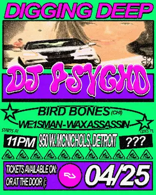 ◥◣DIGGING DEEP◥◣ on April 25, 2026 at RnR Saloon/Detroit Eagle, Detroit features DJ Psycho, Bird Bones, we1sman and Wax Assassin performing house DJ sets.