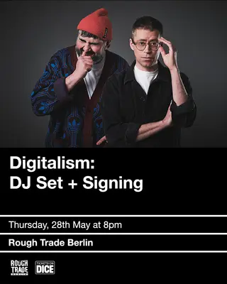 Digitalism: 'Optimism' DJ Set + Signing takes place at Rough Trade Berlin in Berlin, Germany, on May 28, 2026. Digitalism is an electronica duo from Germany known for their blend of house and techno elements. They gained prominence in the mid-2000s with their energetic tracks and remixes, showcasing a distinctive style that combines catchy melodies with a danceable beat. This event will feature their DJ set, along with a signing session for fans.