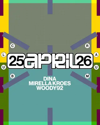 DINA, Mirella Kroes, Woody92 on April 25, 2026 at CLUB RAUM, Amsterdam features DINA, Mirella Kroes and Woody92 performing DJ sets.