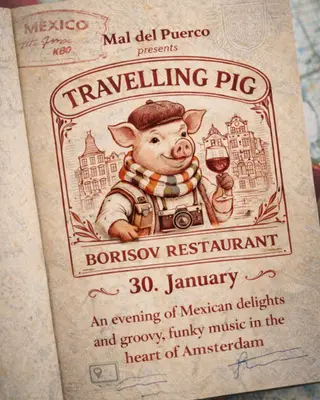 Dine & Dance by Mal del Puerco takes place on January 30, 2026, at Borisov Amsterdam in Amsterdam, Netherlands. This event features genres including House and Funk / Soul.