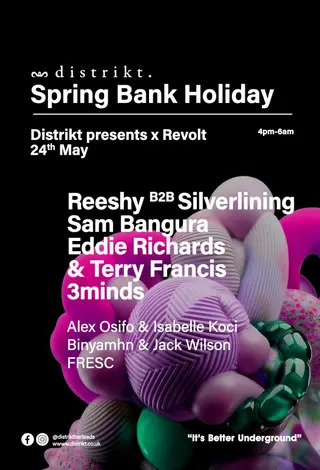 Distrikt x Revolt presents Reeshy B2B Silverlining, Sam Bangura, Eddie Richards & Terry Francis on May 24, 2026 at Distrikt, Leeds features Reeshy, Silverlining, Sam Bangura, Eddie Richards, Terry Francis, 3 Minds, Isabelle Koci and Binyamhn performing house DJ sets.