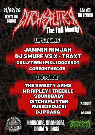 Ditchsplitter: The Full Monty takes place at The Fenton in Leeds, United Kingdom on February 21, 2026. Hardcore and Breakcore sounds all night.