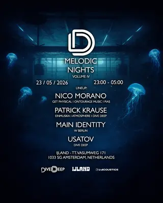 Dive Deep: Melodic Nights - Volume IV takes place at Ijland in Amsterdam, Netherlands on May 23, 2026. Featuring Nico Morano, Patrick Krause, Main Identity, Usatov. Progressive House and Deep House sounds all night.