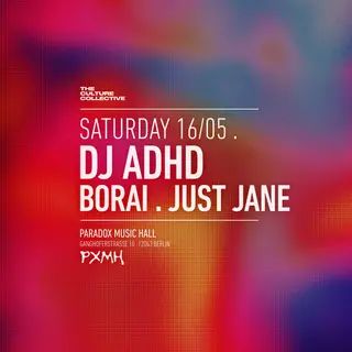 DJ ADHD & Borai & Just Jane - Berlin takes place at Paradox Music Hall in Berlin, Germany on May 16, 2026.