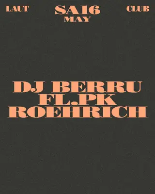 Dj Berru + fl.pk + Roehrich on May 16, 2026 at LAUT, Barcelona features Dj Berru and Roehrich performing techno DJ sets.