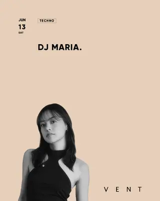 DJ MARIA takes place at VENT in Tokyo, Japan, on June 13, 2026. The event features DJ MARIA, a techno artist known for her innovative sound and contributions to the genre. She is recognized for her dynamic sets and has made a mark in the electronic music scene with her unique approach to techno. This event is dedicated to the techno genre.