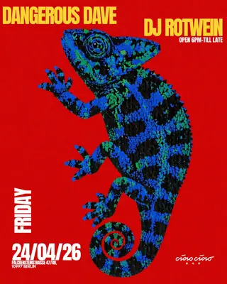 DJ Rotwein, Dangerous Dave takes place at ciao ciao Bar in Berlin, Germany on April 24, 2026. Featuring Balearic Banana, Dangerous Dave. Balearic and Krautrock sounds all night.