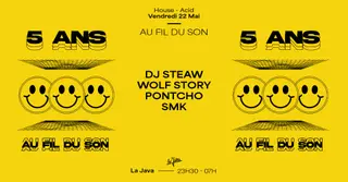 DJ Steaw, Wolf Story, Pontcho & Smk: Afds 5 Ans takes place at La Java in Paris, France on May 22, 2026. Featuring DJ Steaw, Wolf Story, Pontcho. House and Acid sounds all night.