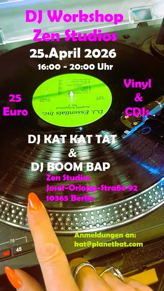 DJ Workshop with DJ KAT KAT TAT & DJ BOOM BAP (Vinyl & CDJs) takes place at Zen Studios in Berlin, Germany on April 25, 2026. Techno and Hip-Hop sounds all night.