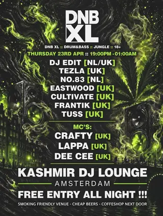 DnB XL on April 23, 2026 at Kashmir Lounge, Amsterdam features electronic music performances DJ sets.