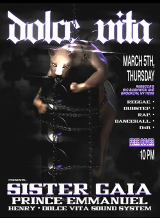 Dolce Vita takes place at Rebecca's in New York, United States on March 4, 2026. Drum & Bass and Dub sounds all night.
