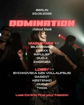 DOMINATION on May 23, 2026 at ://about blank, Berlin features DTEXX, ZAGROZA, Bildgewalt and TIKOA performing techno DJ sets.