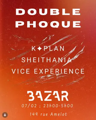 Double Phoque présente House Night Long avec KPlan, Sheithania et Vice Experience takes place at Le Bazar in Paris, France on February 7, 2026. Featuring Vice Experience. Techno and House sounds all night.