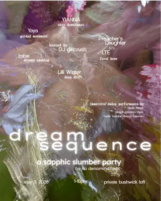 Dream Sequence: A Sapphic Slumber Party takes place at TBA in New York City, United States on May 3, 2026. Featuring zabe, Yaya Flows, YIANNA, Lilli Winter and 2 more. Techno and Downtempo sounds all night.
