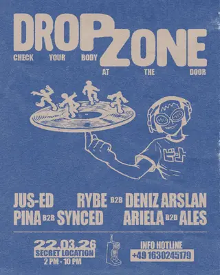 Drop Zone takes place at TBA - Secret Location in Berlin, Germany on March 22, 2026. Featuring Jus-Ed, Deniz Arslan, Rybe. House and Deep House sounds all night.