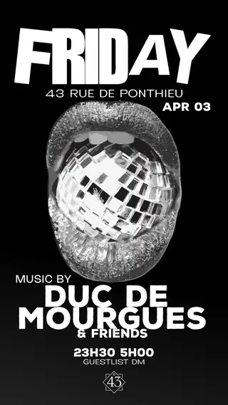 Duc de Mourgues & Friends takes place at TBA - 43 rue de Ponthieu in Paris, France on April 3, 2026. Featuring Duc de Mourgues, Karl Jefferson. House and Disco sounds all night.