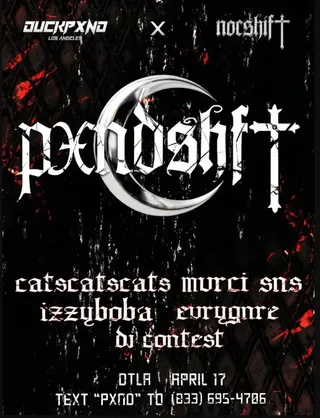 DUCKPXND NOCSHIFT PRESENT - PXNDSHFT on April 17, 2026 at TBA - DTLA SMS OPT IN FOR ADDRESS, Los Angeles features electronic music performances techno DJ sets.