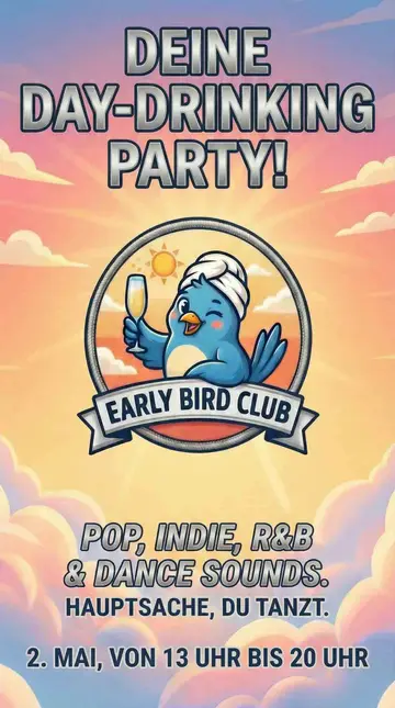 EARLY BIRD CLUB - DEINE DAY-DRINKING PARTY takes place at TBA - EARLY BIRD CLUB in Cologne, Germany on Saturday, May 2, 2026. Pop, Club.