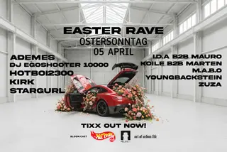 EASTER RAVE x art of urban life x HOT PEOPLE x BLOOM:CAST takes place at Helios37 in Cologne, Germany on April 5, 2026. Featuring ADEMES, HOTBOI2300, Kirk, stargurl and 2 more. Trance and Techno sounds all night.