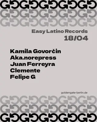 Easy Latino Records takes place at Golden Gate in Berlin, Germany on April 18, 2026. Featuring Kamila Govorčin, Juan Ferreyra, Clemente (ES), Felipe G.