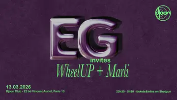 EG invite WheelUP + Marli takes place at Djoon in Barcelona, Spain on Friday, March 13, 2026. Featuring EG (1), Marli, WheelUP. House, Garage.