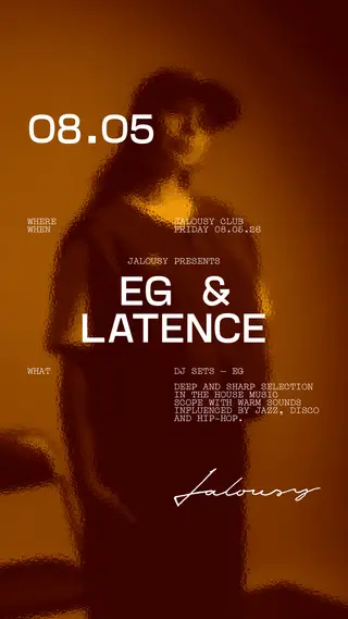 EG & Latence takes place at Jalousy in Brussels, Belgium on May 8, 2026. Featuring EG (1), Latence. Techno and House sounds all night.