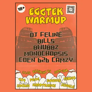 EGGTEK WARMUP takes place at Basement 45 in Bristol, United Kingdom on April 3, 2026. Featuring Coen. Trance and Jungle sounds all night.