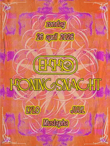 Set at EKKO, EKKO's Koningsnacht 2026 brings together artists and fans in Utrecht on Sunday, April 26, 2026, featuring Mustapha. This event brings together artists and fans who share a passion for dance music culture and House, Garage sounds.