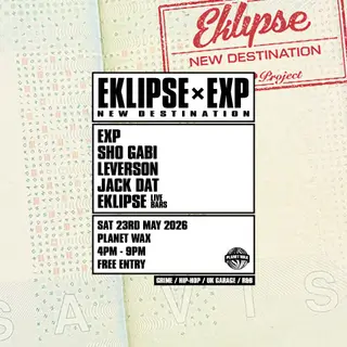 Eklipse x EXP: New Destination takes place at Planet Wax in London, United Kingdom on May 23, 2026. Featuring Sho Gabi, leverson. Hip-Hop and Grime sounds all night.