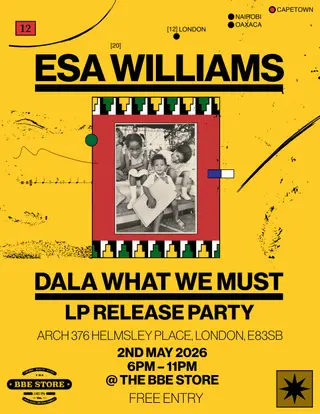 Esa Williams 'Dala What We Must' LP Launch Party takes place at The BBE Store in London, United Kingdom on May 2, 2026. Featuring Esa. Afrobeat and Amapiano sounds all night.