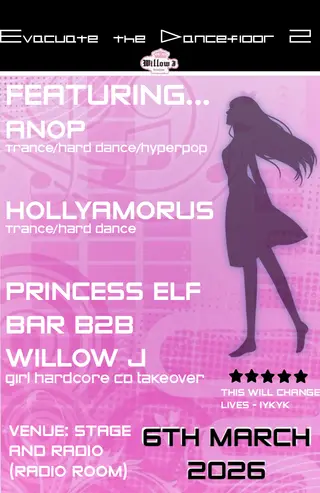 Evacuate the Dancefloor 2 takes place at The Radio Room @ Stage & Radio in Paris, France on March 6, 2026. Featuring Princess Elf Bar, Willow J, Anop. Trance and Hardcore sounds all night.