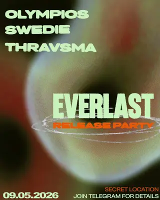 Everlast Release Party takes place at TBA in Berlin, Germany on May 9, 2026. Featuring Olympios, Swedie, Thravsma. Techno sounds all night.