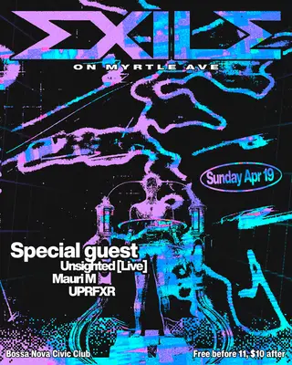 Exile on Myrtle Ave: Unsighted [LIVE] / Special Guest on April 19, 2026 at Bossa Nova Civic Club, New York City features Unsighted and Rob Seurat performing electro DJ sets.