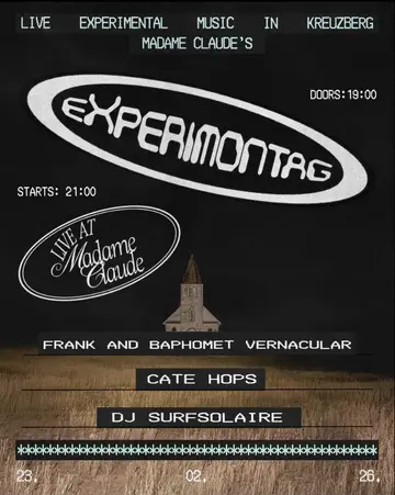 eXperimontag: Frank and Baphomet vernacular (Duo) + Cate Hops (Solo) + SurfSolaire (DJ-Set) takes place at Madame Claude in Berlin, Germany on Monday, February 23, 2026. Experimental.