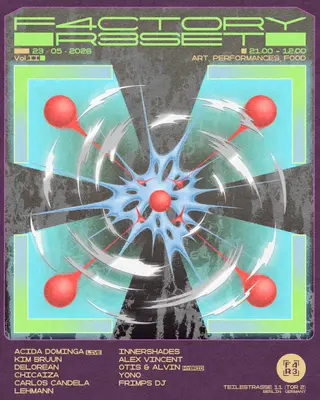 F4ctory R3set Vol.II ⛶ with Acida Dominga, Innershades, Otis on May 23, 2026 at TBA, Berlin features Innershades, OTIS (3), Carlos Candela, Chicaiza, Delorean ºº, Kim Bruun and Alex Vincent performing progressive house DJ sets.