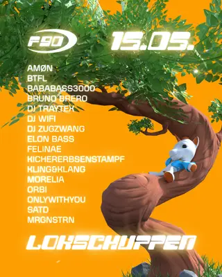 F90 on May 15, 2026 at Lokschuppen Berlin, Berlin features Amøn, BTFL, BabaBass3000, Bruno Brero, DJ Traytex, DJ WIFI, KLING&KLANG, DJ Zugzwang, Morelia, Sober At The Disco, OnlyWithYou, MRGNSTRN, Elon Bass, Felinae, Orbi and kichererbsenstampf performing trance DJ sets.