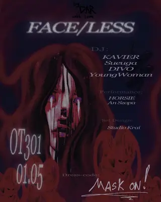 FACE/LESS takes place at OT301 in Amsterdam, Netherlands on May 1, 2026. Featuring Sueuga, YoungWoman, Krai. Experimental sounds all night.