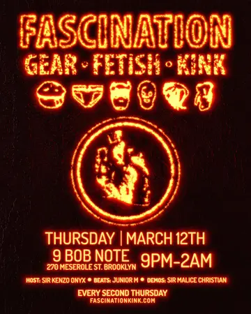 Fascination NYC takes place at 9 Bob Note in New York City, Unknown on Thursday, March 12, 2026. Featuring Junior M (US). Techno, Acid.