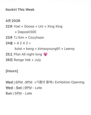 Kockiri is a club in Seoul, South Korea. Located at 46, Usadan-ro, Yongsan-gu, Seoul, 04405, Republic of Korea.