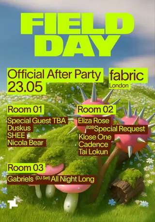Field Day Afterparty: Special Guest TBA, Eliza Rose B2B Special Request, Duskus + more takes place at fabric in London, United Kingdom on May 23, 2026. Featuring Duskus, SHEE, Nicola Bear, Eliza Rose and 4 more.