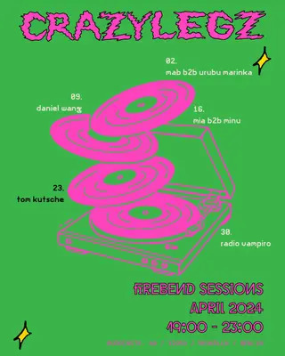 fireabend on April 23, 2026 at Crazylegz, Berlin features Selector X, Boogie and BERLIN performing house DJ sets.