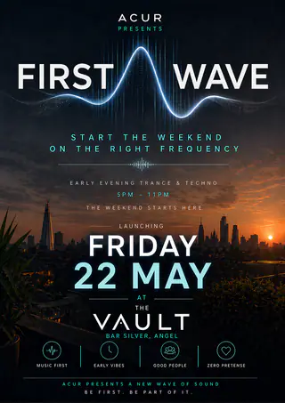First Wave - Trance, Progressive & Techno Evening Party takes place at TBA in London, United Kingdom on May 22, 2026. Trance and Techno sounds all night.