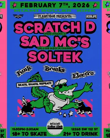 Flight 808 Skate Night takes place at Miami Roller Rink in Detroit, United States on Saturday, February 7, 2026. Featuring Sad MC's, Alexx in Chainss, Sel.6. Bass, Electro.