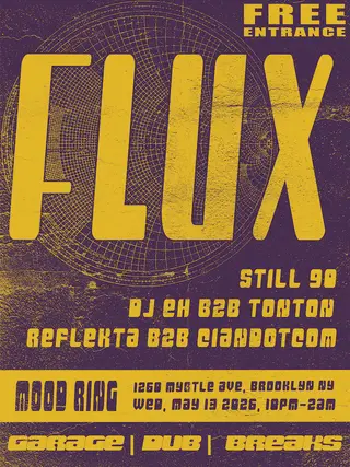 Flux presents Ciandotcom b2b Reflekta, tonton b2b DJ eh, Still 90 on May 13, 2026 at Mood Ring, New York City features tonton, DJ eh and 90 (1) performing DJ sets.