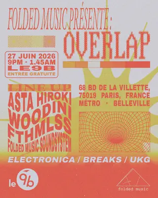 Folded Music présente: Overlap takes place at Le 9B in Paris, France on June 27, 2026. Broken Beat and Electronica sounds all night.