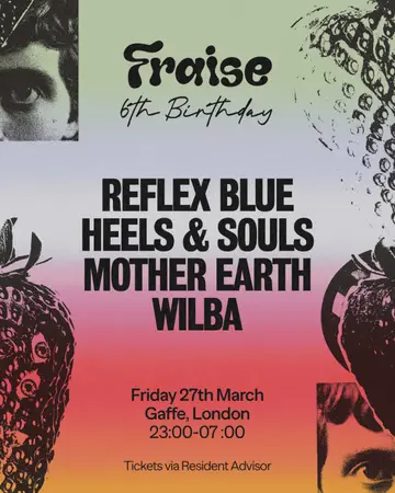 Fraise 6th Bday w/ Reflex Blue, Heels & Souls, Mother Earth & Wilba takes place at Gaffe in London, United Kingdom on Friday, March 27, 2026. Featuring Reflex Blue, Heels & Souls, Mother Earth, Wilba. Tech House, Deep House.