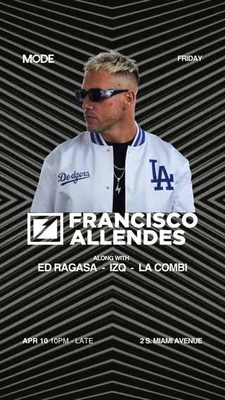 Francisco Allendes & More takes place at MODE Downtown Miami in Miami, United States, on April 10, 2026. Headlining the event is Francisco Allendes, a Chilean DJ and producer known for his contributions to the house and tech house genres. He has released tracks on notable labels such as Desolat and Cadenza, showcasing a distinctive blend of driving rhythms and melodic elements. The event features house and tech house music, emphasizing the dynamic styles of the electronic music spectrum.