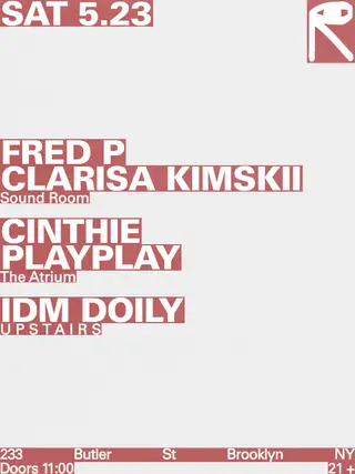 Fred P, Clarisa Kimskii / Cinthie, PlayPlay / IBM Doily takes place at public records in New York City, United States on May 23, 2026. Featuring Fred P, Clarisa Kimskii, Cinthie, PlayPlay and 1 more. Techno and House sounds all night.